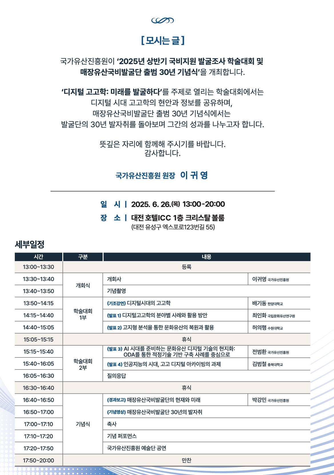 2025년 상반기 국비지원 발굴조사 학술대회 및 매장유산국비발굴단 출범 30주년 기념식
