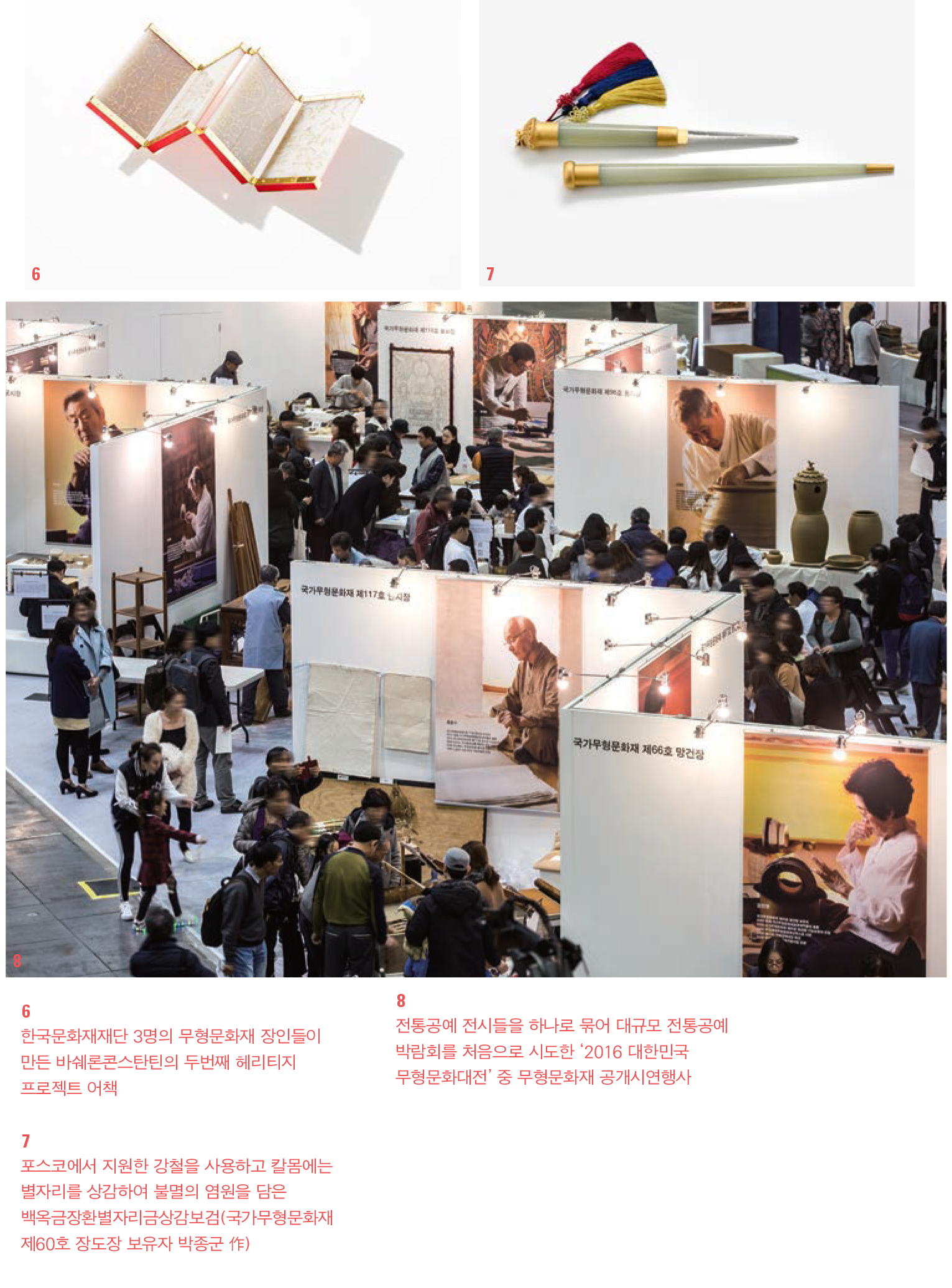 KINTEX에서 열린 ‘2016 대한민국 무형문화재 대전’은 기존의 무형문화재와 전통공예 전시 행사를 총망라한 새로운 전시로 우리 무형문화재의 과거, 현재, 미래를 한 장소에서 볼 수 있는 뜻깊은 자리였다. 2016년 첫선을 보인 무형문화재대전은 한국문화재재단이 야심차게 준비한 행사로, ‘Korean Ethos’를 주제로 진행되었다. 전시관은 무형문화재관, 주제관, 특별관, 공예단체관, 기업관, 한국문화재재단 사업관, 대한민국전승공예대전관, 대한민국공예품대전관, 체험관으로 구성되었다.