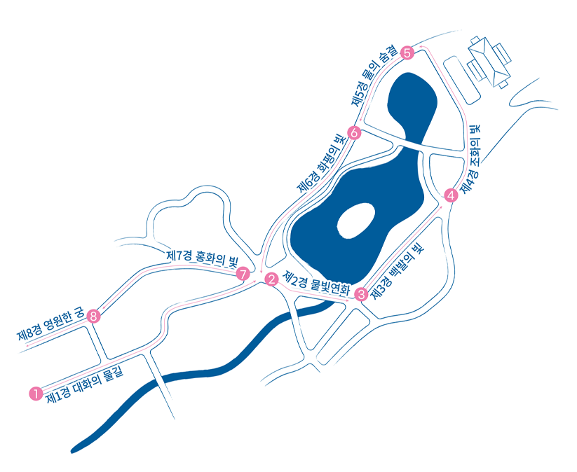 The logogram “花” — blossoming — is the visual motif giving meaning to the light ripples upon Chundangji Pond as a harmonization of both the visible and invisible beauty of Changgyeonggung Palace. The triumphs and tragedies of the Palace are given form as threads of light weaving through the water's surface into a flower of harmony and peaceful coexistence that will blossom as petals of water- drops and light in the heart of modern man.
