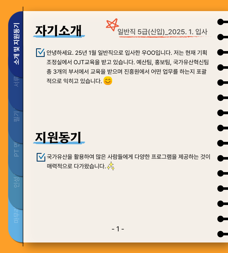 ○ 안녕하세요. 25년 1월 일반직으로 입사한 우OO입니다. 저는 현재 기획조정실에서 OJT교육을 받고 있습니다. 예산팀, 홍보팀, 국가유산혁신팀 총 3개의 부서에서 교육을 받으며 진흥원에서 어떤 업무를 하는지 포괄적으로 익히고 있습니다.