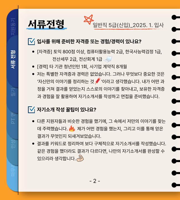 - 저는 특별한 자격증과 경력은 없었습니다. 그러나 무엇보다 중요한 것은 '자신만의 이야기를 정리하는 것'이라고 생각했습니다. 내가 어떤 과정을 거쳐 결과를 얻었는지 스스로의 이야기를 찾아내고, 보유한 자격증과 경험을 잘 활용하여 자기소개서를 작성하고 면접을 준비했습니다.