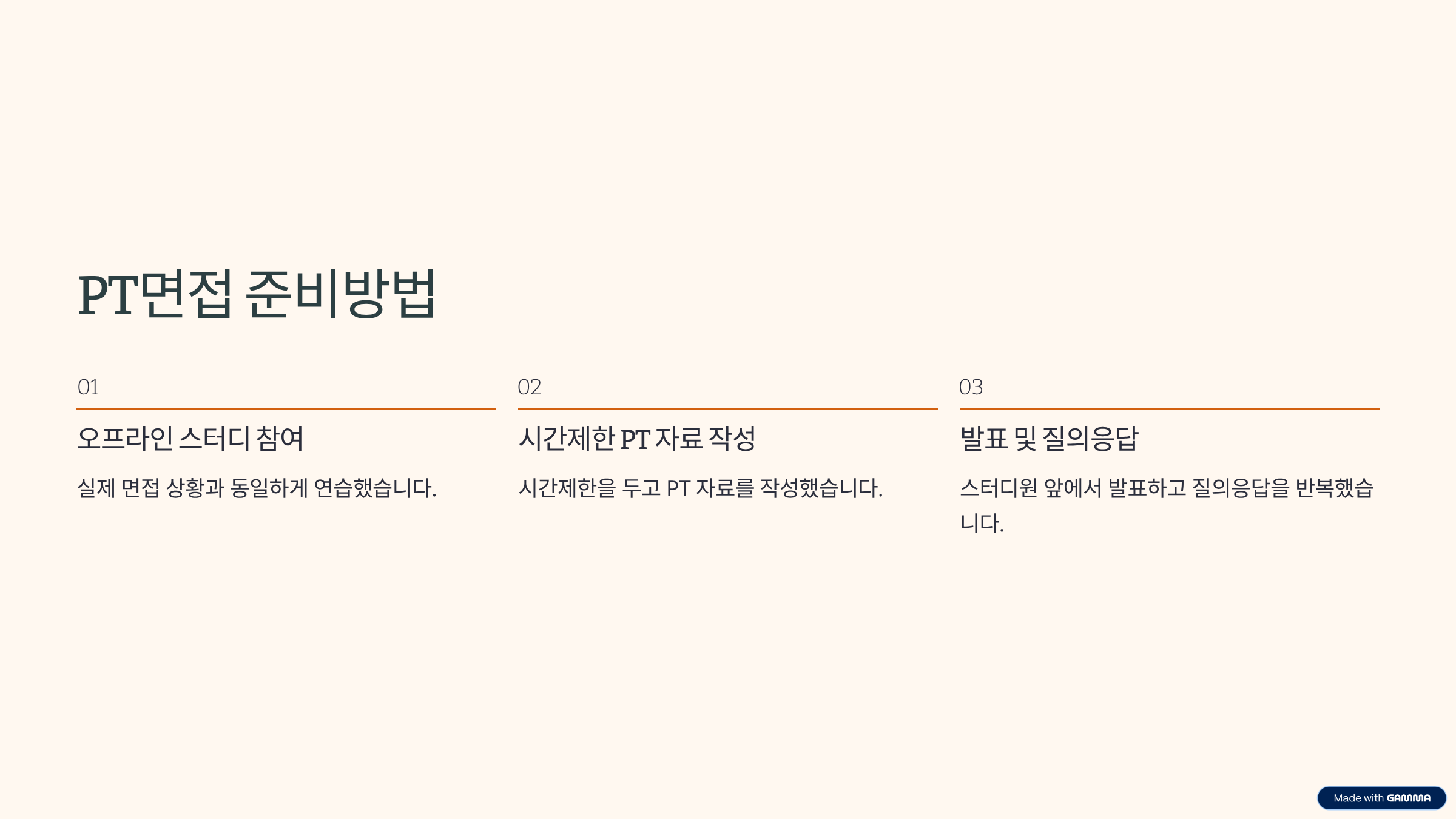 - 오프라인 스터디 참여: 실제 면접 상황과 동일하게 연습했습니다.