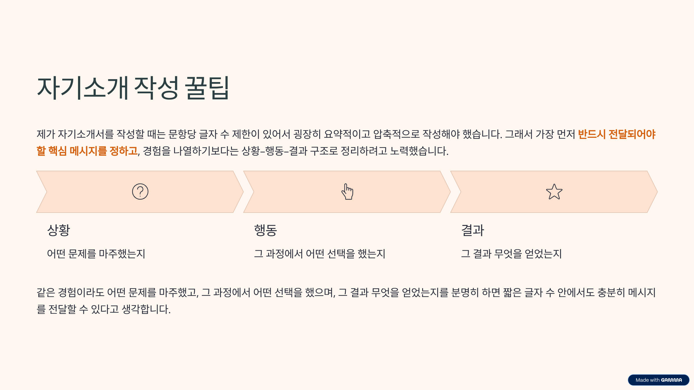 제가 자기소개서를 작성할 때는 문항당 글자 수 제한이 있어서 굉장히 요약적이고 압축적으로 작성해야 했습니다. 그래서 가장 먼저 반드시 전달되어야 할 핵심 메시지를 정하고, 경험을 나열하기보다는 상황–행동–결과 구조로 정리하려고 노력했습니다. 같은 경험이라도 어떤 문제를 마주했고, 그 과정에서 어떤 선택을 했으며, 그 결과 무엇을 얻었는지를 분명히 하면 짧은 글자 수 안에서도 충분히 메시지를 전달할 수 있다고 생각합니다.