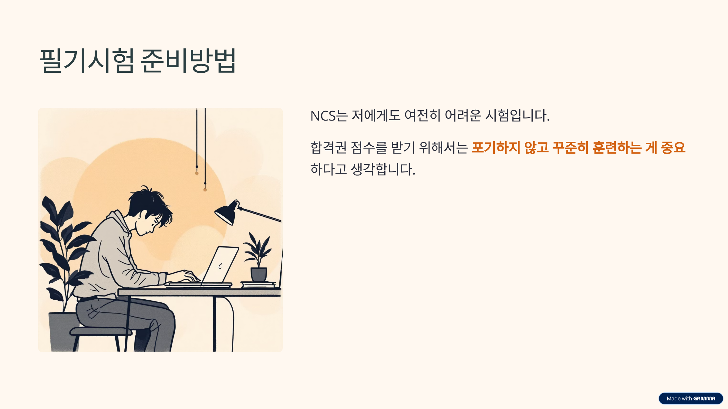NCS는 저에게도 여전히 어려운 시험입니다. 합격권 점수를 받기 위해서는 포기하지 않고 꾸준히 훈련하는 게 중요하다고 생각합니다.