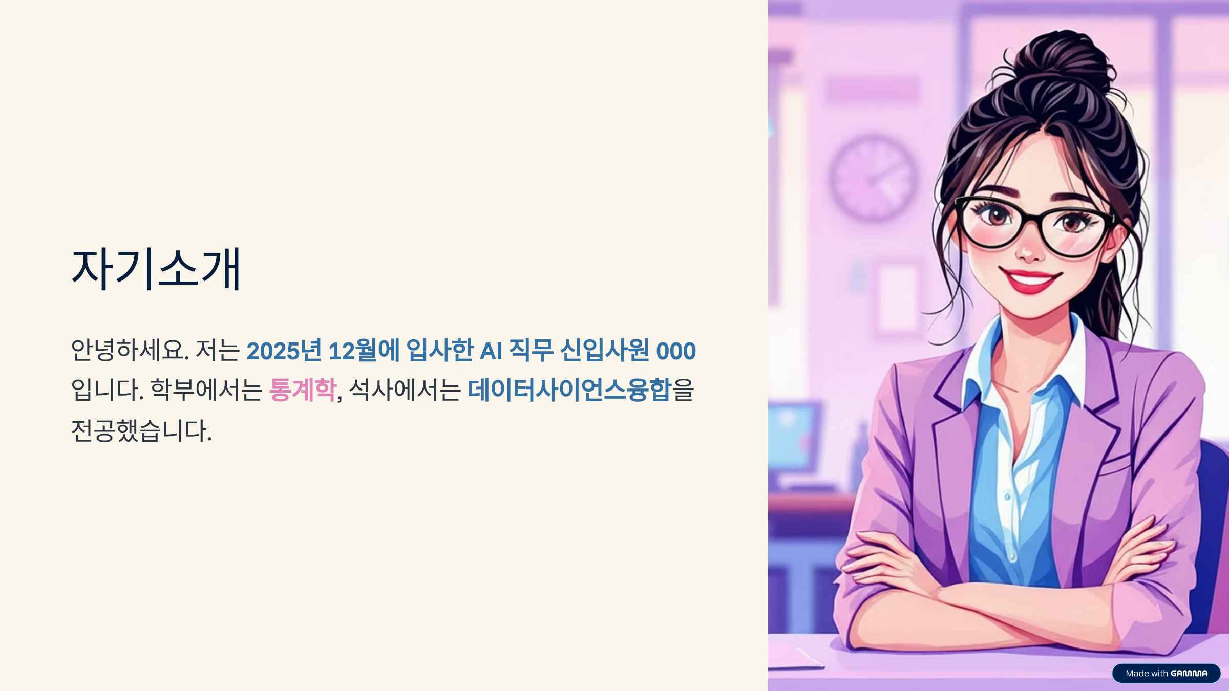 안녕하세요. 저는 2025년 12월에 입사한 AI 직무 신입사원 공OO입니다. 학부에서는 통계학, 석사에서는 데이터사이언스융합을 전공했습니다.