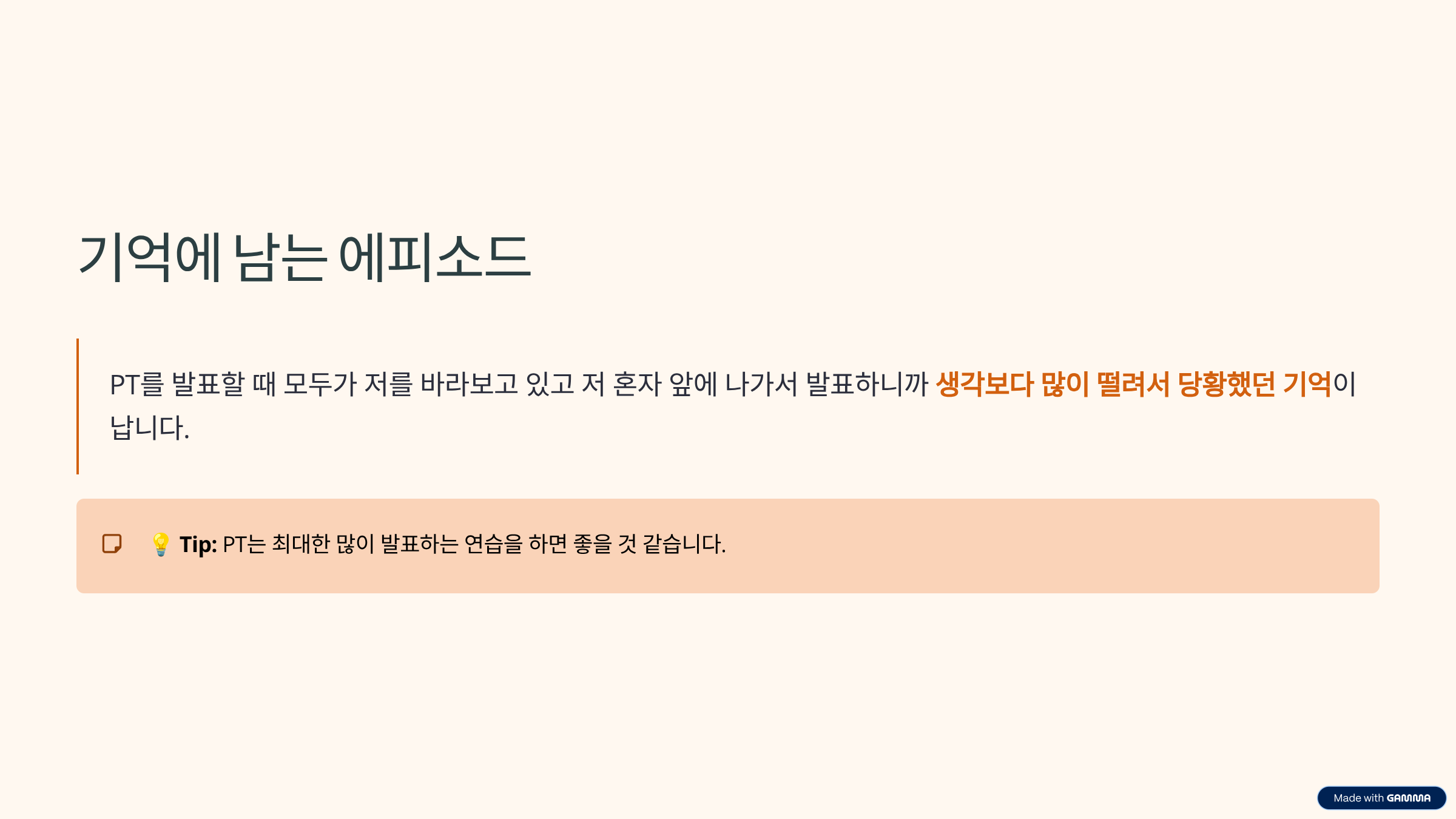 - 기억에 남는 에피소드: PT를 발표할 때 모두 저를 바라보고 있고 저 혼자 앞에 나가서 발표하니까 생각보다 많이 떨려서 당황했던 기억이 납니다.(Tip: PT는 최대한 많이 발표하는 연습을 하면 좋을 것 같습니다.)