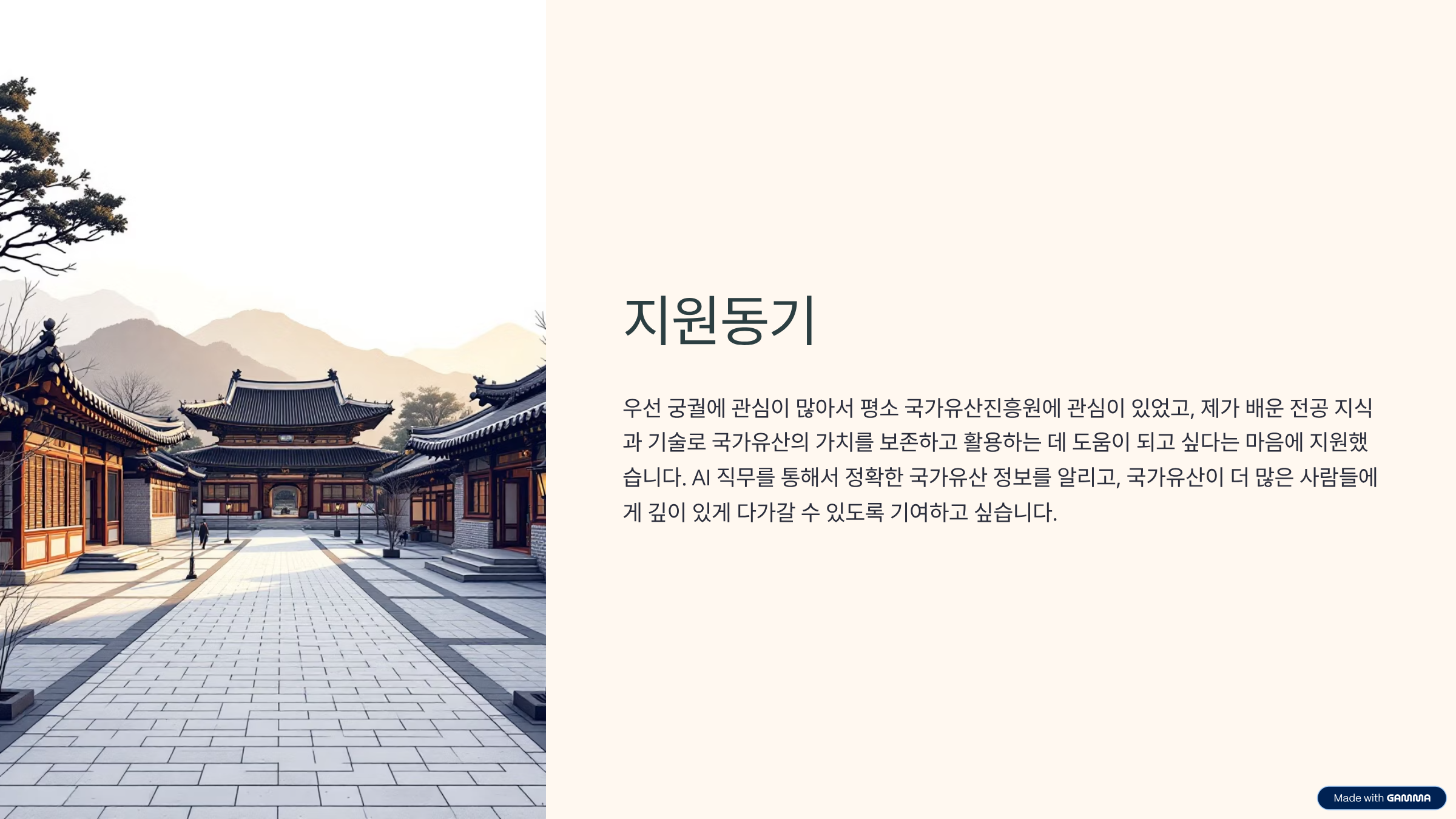 우선 궁궐에 관심이 많아서 평소 국가유산진흥원에 관심이 있었고, 제가 배운 전공 지식과 기술로 국가유산의 가치를 보존하고 활용하는 데 도움이 되고 싶다는 마음에 지원했습니다. AI 직무를 통해서 정확한 국가유산 정보를 알리고, 국가유산이 더 많은 사람들에게 깊이 있게 다가갈 수 있도록 기여하고 싶습니다.