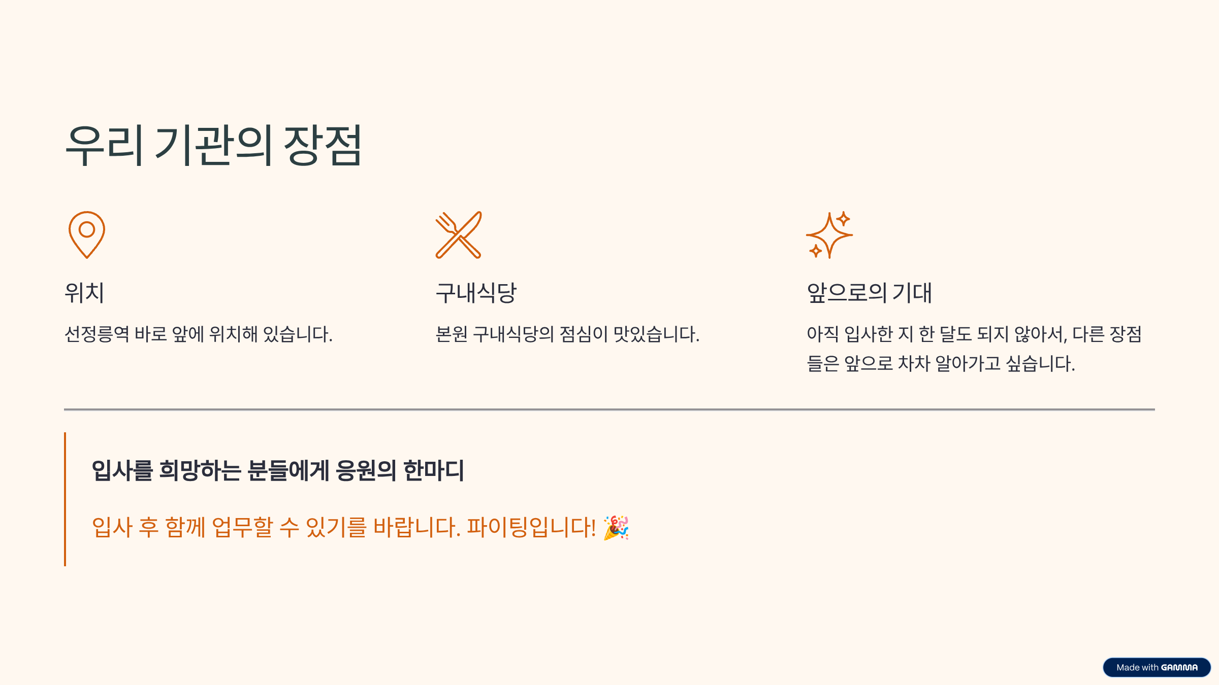 - 앞으로의 기대: 아직 입사한 지 한 달도 되지 않아서, 다른 장점들은 앞으로 차차 알아가고 싶습니다.