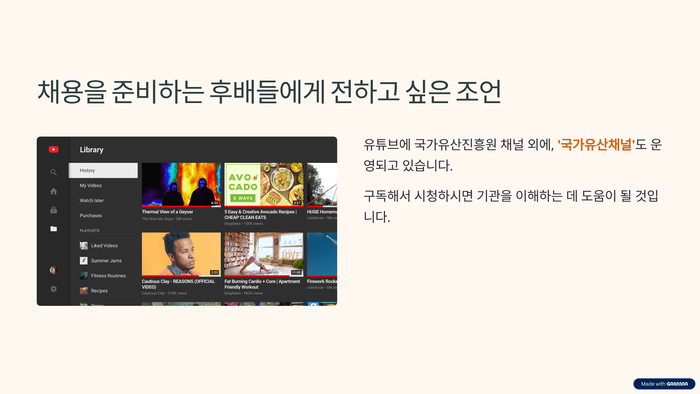 유튜브에 국가유산진흥원 채널 외에, ‘국가유산채널’도 운영되고 있습니다. 구독해서 시청하시면 기관을 이해하는 데 도움이 될 것입니다.