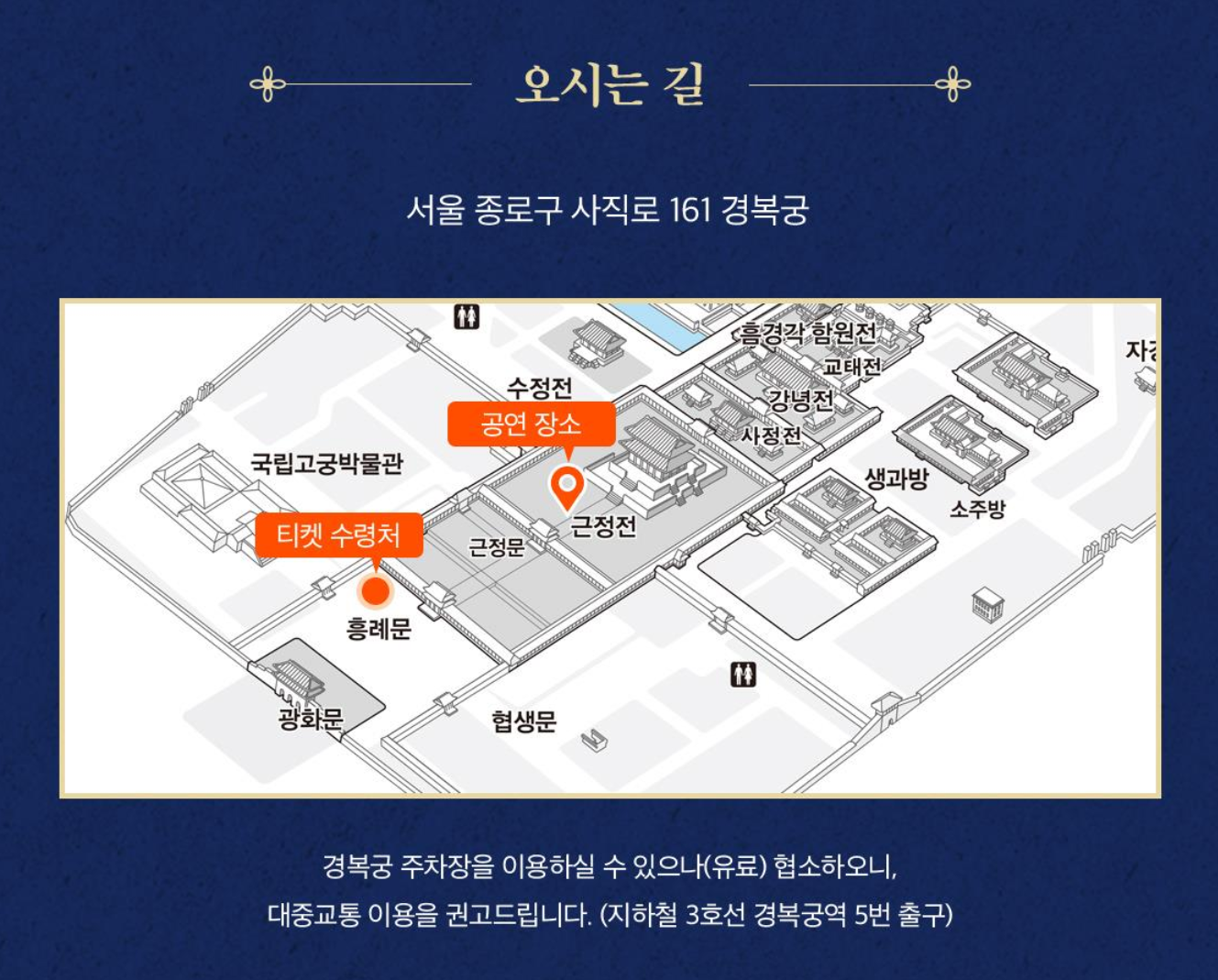 * 공연 당일 18시 이후 광화문은 개방하지 않습니다. 첫 번째 입장은 용성문에서만 18시 10분부터 진행합니다. (협생문 X)