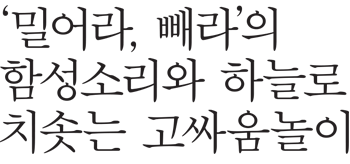 고의 제작이 완료되면 고를 메고 각각 자기 마을의 앞을 행진한다. 서부팀은 하칠석 앞을, 동부팀은 상칠석 앞을 지난다. 이때 각 팀의 풍물패들이 동행하면서 놀이의 축제 분위기를 고조시키고 전의를 북돋운다. 상대편의 고를 만나면 때로는 서로 힘의 우위성을 과시하기 위해 시위를 하기도 한다. 각자의 동네 앞을 행진한 다음 동네 앞 논으로 향하여 본격적으로 놀이를 시작한다. 지금은 전수관의 마당에서 놀이가 이루어진다. 놀이판에 도착하면 서로의 전의를 북돋울 수 있는 노래를 부르거나 함성을 지르면서 전열을 가다듬는다. 서로가 싸울 수 있는 분위기가 고조되면 줄패장의 지휘에 따라 두 고가 정면을 대하고 싸움을 준비한다. 앞으로 전진하다가 뒤로 후퇴하는 것을 몇 번 거듭하다가 줄패장이 “밀어라” 하고 명령하면 놀이꾼들은 함성을 지르며 상대방 고의 정면에 부딪친다. 그러면 상대방의 줄패장을 밑으로 밀어내려고 줄패장들 간에 심한 몸싸움이 벌어진다. 전세가 불리하여 줄패장이 “빼라”라는 명령을 하면 놀이꾼들은 고를 받아 어깨에 메고 뒤로 물러서면서 풍물패의 신명나는 가락에 맞추어 전열을 정비한다. 이처럼 전진과 후퇴 속에 이뤄지는 정면 공격과 회전을 통해 측면 공격을 반복하면서 1시간 정도 싸움이 벌어진다. 싸움이 끝나면 패한 팀이 다시 도전하려고 들지만 승리한 팀은 고의 머리를 돌려 응전하지 않고 승전가를 부르면서 자기 마을로 향한다.