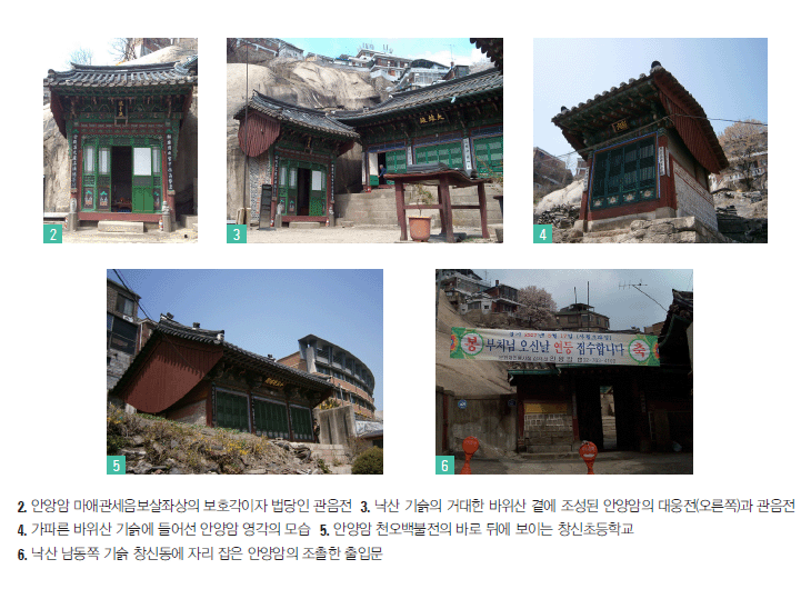 33관음성지는 4대 관음성지를 비롯해 서울의 조계사·봉은사·도선사, 부산 범어사, 경기의 용주사와 신륵사, 강원의 신흥사·법흥사·월정사·구룡사, 충남의 수덕사와 마곡사, 충북의 법주사, 전북의 금산사·내소사·선운사·백양사, 전남의 대흥사·송광사·화엄사·쌍계사, 경북의 동화사·은해사·직지사·고운사·기림사·불국사, 경남의 해인사와 통도사다. 목록을 보면 관음성지는 전국을 망라하고 있는 듯하지만 고개가 갸웃거려지기도 한다. 서울지역에서는 조계사와 봉은사, 도선사가 관음성지로 소개됐지만, 본격적인 관음도량이라고 하기에는 다소 무리가 있어 보인다. 하기는 서울에서 명실상부한 관음도량으로 내세울 만한 사찰을 찾기 어려운 것도 사실이다. 아마도 33관음성지의 선정에는 적지 않은 고심이 뒤따랐을 것이다. 그런데 최근 서울의 대표적인 관음성지로 충분히 의미를 부여할 수 있을 것 같은 관음도를 하나 둘러볼 수 있었다. 연극의 거리로 유명한 대학로의 뒷산인 낙산의 안양암이 그곳이다. 안양암은 낙산의 남동쪽인 창신동 골목의 화강암 산기슭에 조금은 위태롭게 자리 잡고 있다. 바위산에는 마애관세음보살좌상이 있는데, 앞쪽으로는 경주 석굴암을 연상시키는 덧집이 세워져 있다.